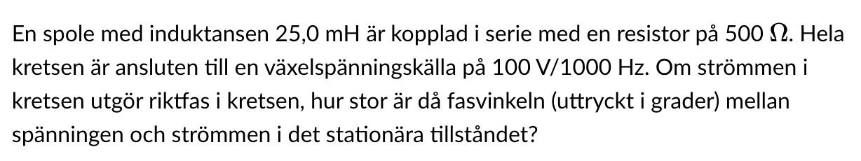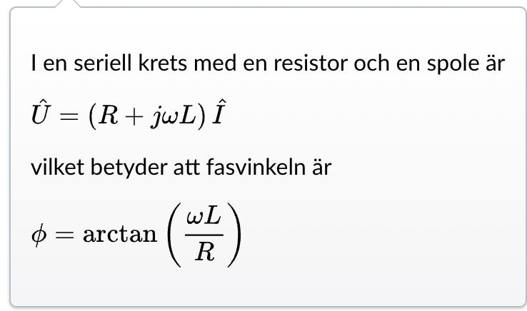 Hej! Jag förstår hur Ohms lag ska se ut för en LR-krets, men jag förstår inte hur man går från det till det uttrycket för fasvinkeln som man får i ledningen. Jag har försökt att använda (valde ström som riktfas) utan framgång och därför har jag ingen påbörjad lösning att visa upp.