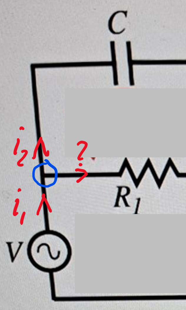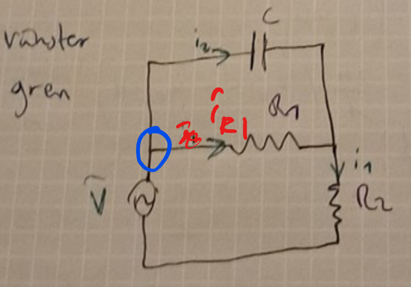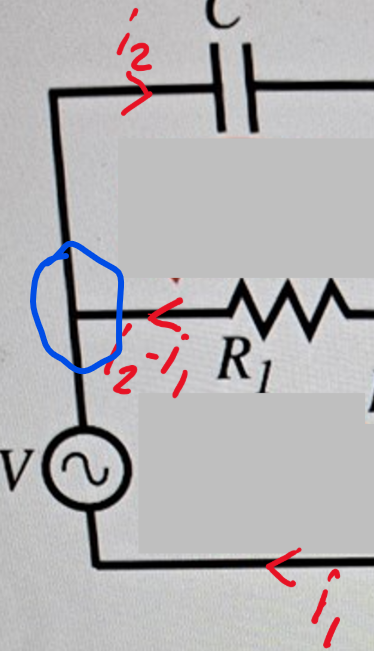 Som originalfiguren är ritad så visar figuren att strömmen i2 flyter genom C (och skapar ett spänningsfall), och strömmen i1 flyter genom spänningskällan V. Men originalfiguren visar också att både i1 och i2 flyter genom R1 och skapar _var sitt_ spänningsfall som måste räknas med när man summerar spänningsfall enligt Kirchoffs spänningslag.
