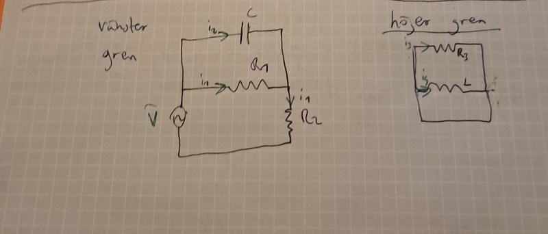Bra (nu kan vi försöka rätta till feltänket)! Fokusera på den vänstra grenen du ritade. Vad blir iR1, dvs den ström som flyter genom R1, uttryckt i i1 och i2? (ledtråd: Använd Kirchoffs strömlag)