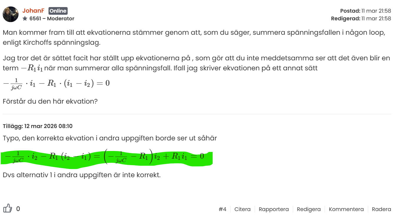 Visst stämmer inte den första ekvationen  i den andra bilden? För jag får att det flyter i2-i1 över R1? Där borde det vara (-1/jwC+R1)i2-R1i1=0