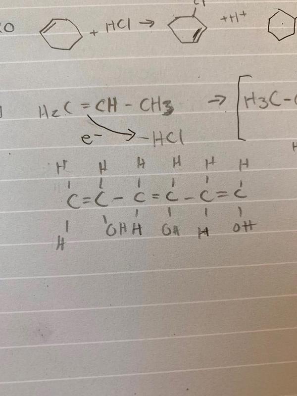 Jag har ritat upp en liten bit av en polyvinylalkohol. Jag tänkte den skulle vara linjär, men tydligen är den veckad. Monomeren är H2C=CHOH, men i facit finns det inga dubbelbindningar mellan kolen. Varför?