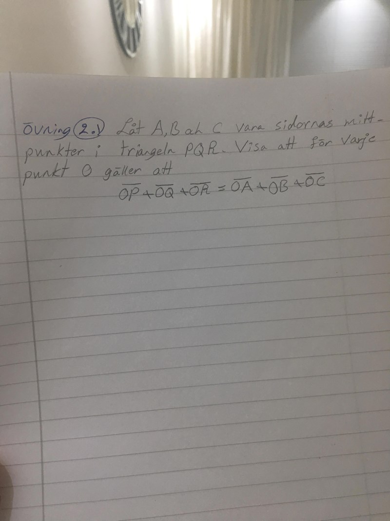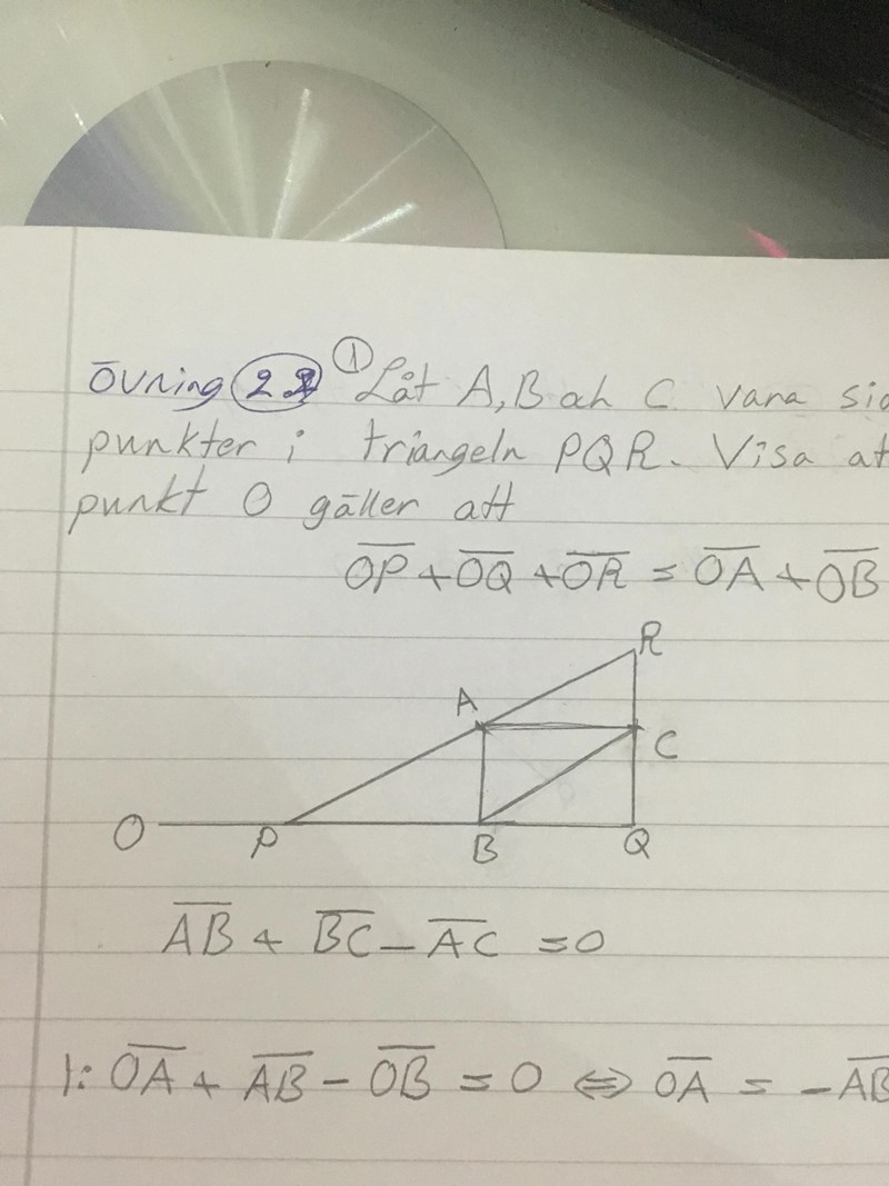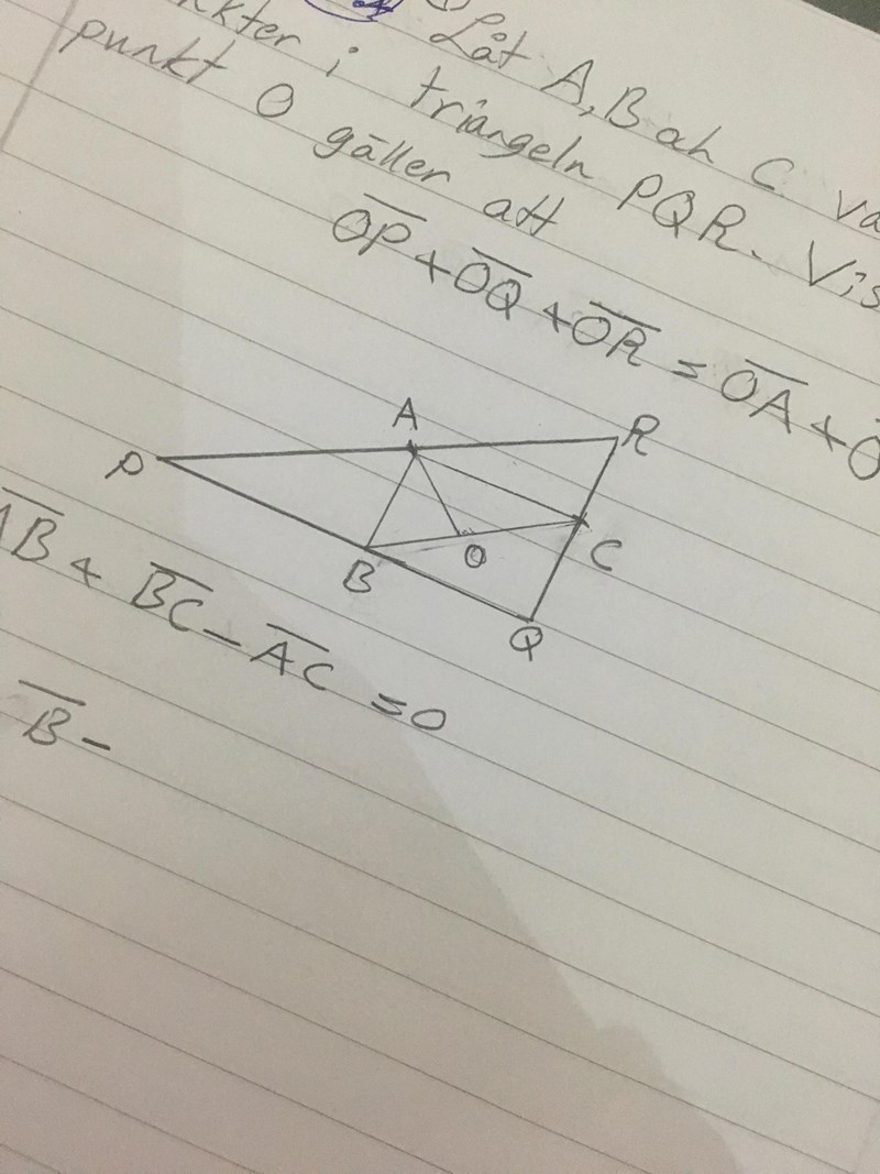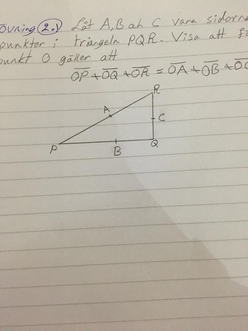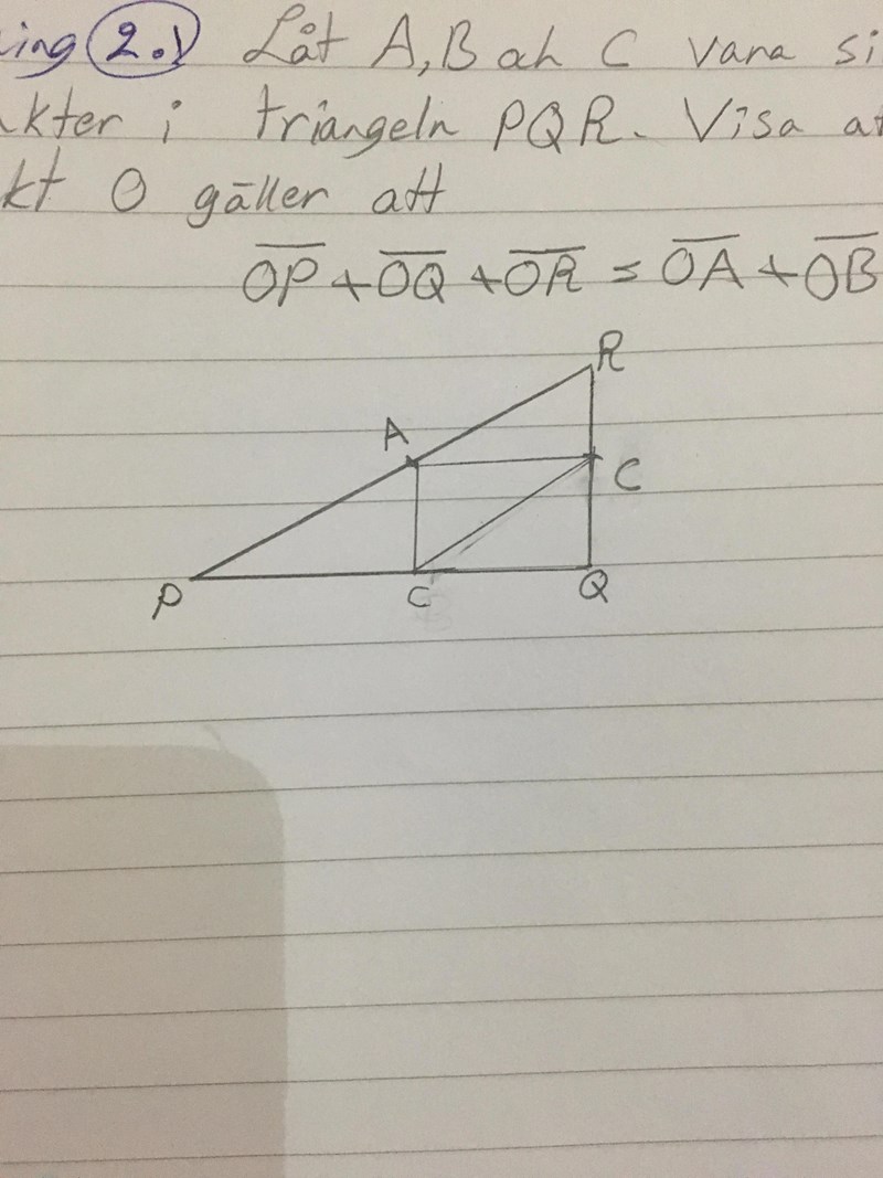 Smaragdalena skrev:Du skall visa något som skall gälla för varje punkt O, så sätt ut en precis var som helst - i den lilla triangeln, i den stora triangeln eller utanför. (Det vore opraktiskt att placera punkten utanför pappret, men det skulle stämma då också!)