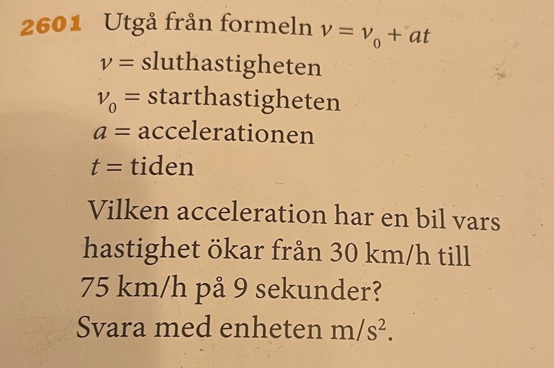 Använd formeln. v, v0 och t står i uppgiften. Du ska räkna ut a.