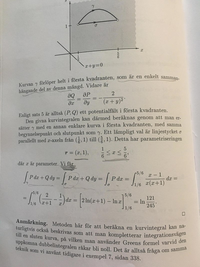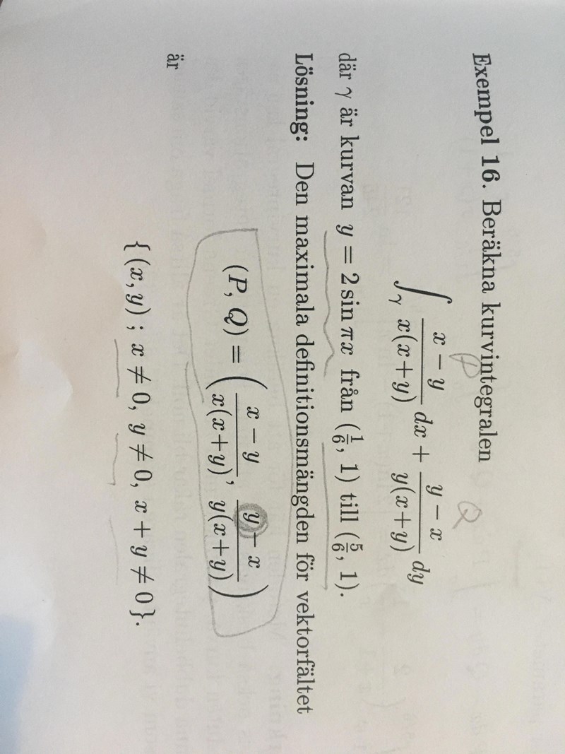 Hej, jag undrar på hur integralen av Pdx+Qdy blir till integral av P dx, när vi sätter inn parametern r= (x,1) i den sista del av lösningen