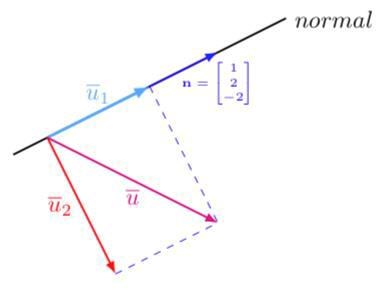 Hur stor är projektionen av din vektor u på normalvektorn? Vad blir resten (dvs det som är vinkelrätt)?