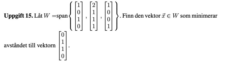 Det visar sig att systemet har den entydiga lösningen . Slutligen anger vi den vektor som minimerar avståndet: