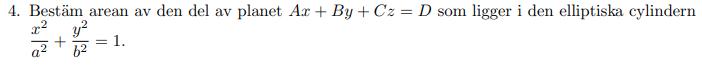 Jag förstår inte hur jag ska gå tillväga för att lösa den här uppgiften. Jag antar att jag ska parametrisera ytan eller cylindern på något vis. Ett försök till att beräkna ds för planet Ax + By + Cz = D: