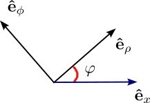 e^x=cos(φ)e^ρ-sin(φ)e^φ\mathbf{\hat{e}}_x =\cos(\varphi)\mathbf{\hat{e}}_\rho - \sin(\varphi) \mathbf{\hat{e}}_\varphi