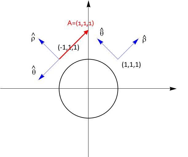 Det jag tror du missat är att basvektorerna snurrar med när vi önskar beskriva en vektor lokalt i en viss punkt i koordinatsystemet. Notera hur riktningen på och ändras från punkt till punkt.