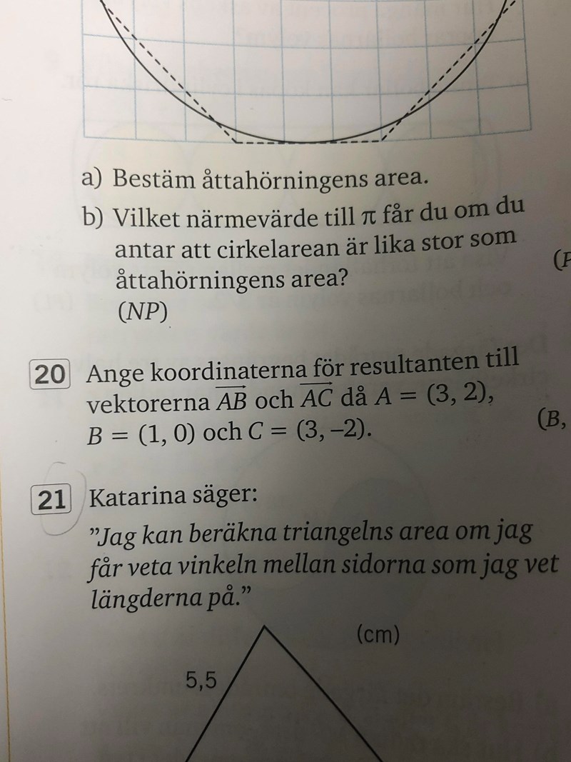 Uppgift 20)jag får svaret till (1,-2) . Resultatet blir den vektorn som kallas för BC i min bild. Men det blir fel