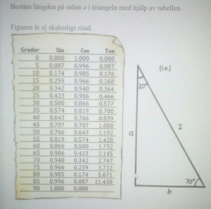 Hej! Jag försökt lösa denna uppgift genom att se vad 20 grader cinus är, eftersom a är närliggande katet för vinkel 20. Då fick jag svaret 0,940 men det är fel. Hur ska jag tänka då?