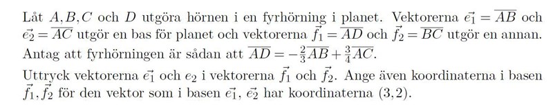Okej vad bra! Nu vill jag ju byta bas från e1,e2 till f1,f2 för ex vektor v med koordinaterna (3,2). Hur gör jag det?
