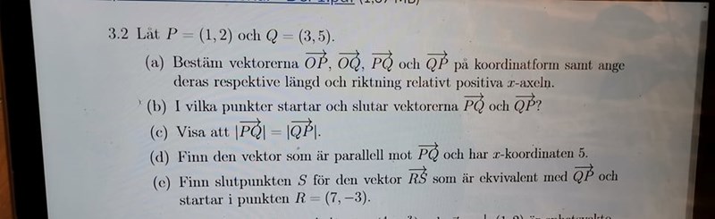 På a) har du inte bestämt vektorerna PQ eller QP. Du har i princip redan gjort det i b), dock. Vektorn PQ är den vektor som går mellan (1,2) och (3,5). Vilken vektor är det?