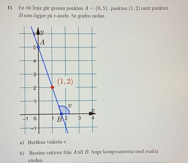 Ett sätt är att bestämma ekvationen y = kx + m för den linje som går genom punkterna A och (1, 2) och sedan bestämma var linjen skär x-axeln (detta sker i punkten B).