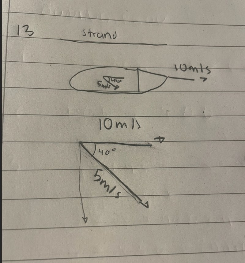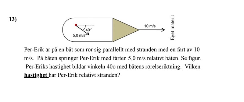 På bilden nedan är a båtens hastighet, b är JEs hastighet relativt båten och e är JEs hastighet relativt land.