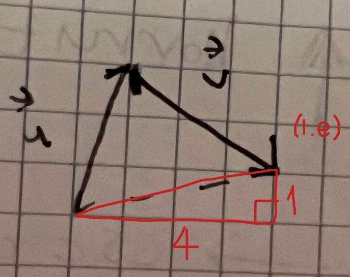 Jo du får till det. Den streckade linjen representerar u+v. Den utgör hypotenusan i en triangel med basen 4 l.e. och höjden 1 l.e. Förstår du?