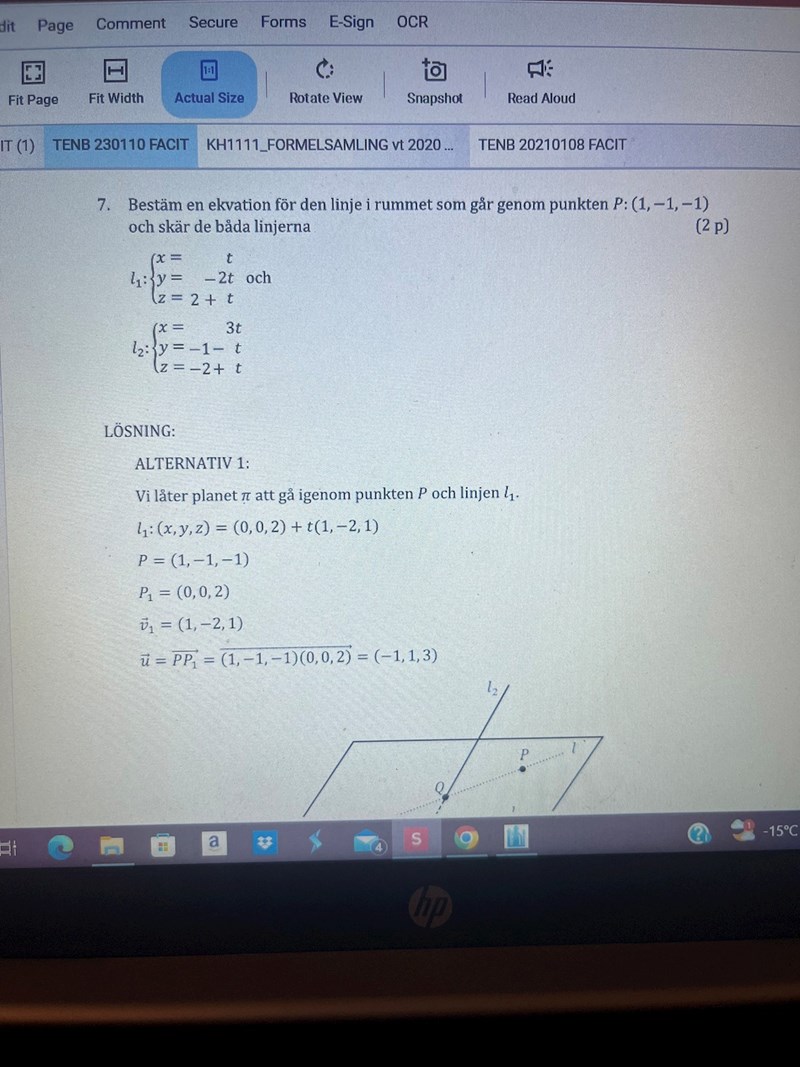 Det går även att lösa uppgiften utan att skapa ett plan, men det är mer algebra.