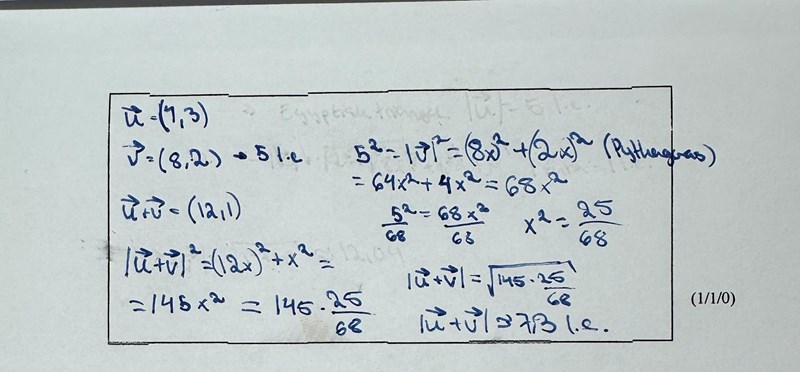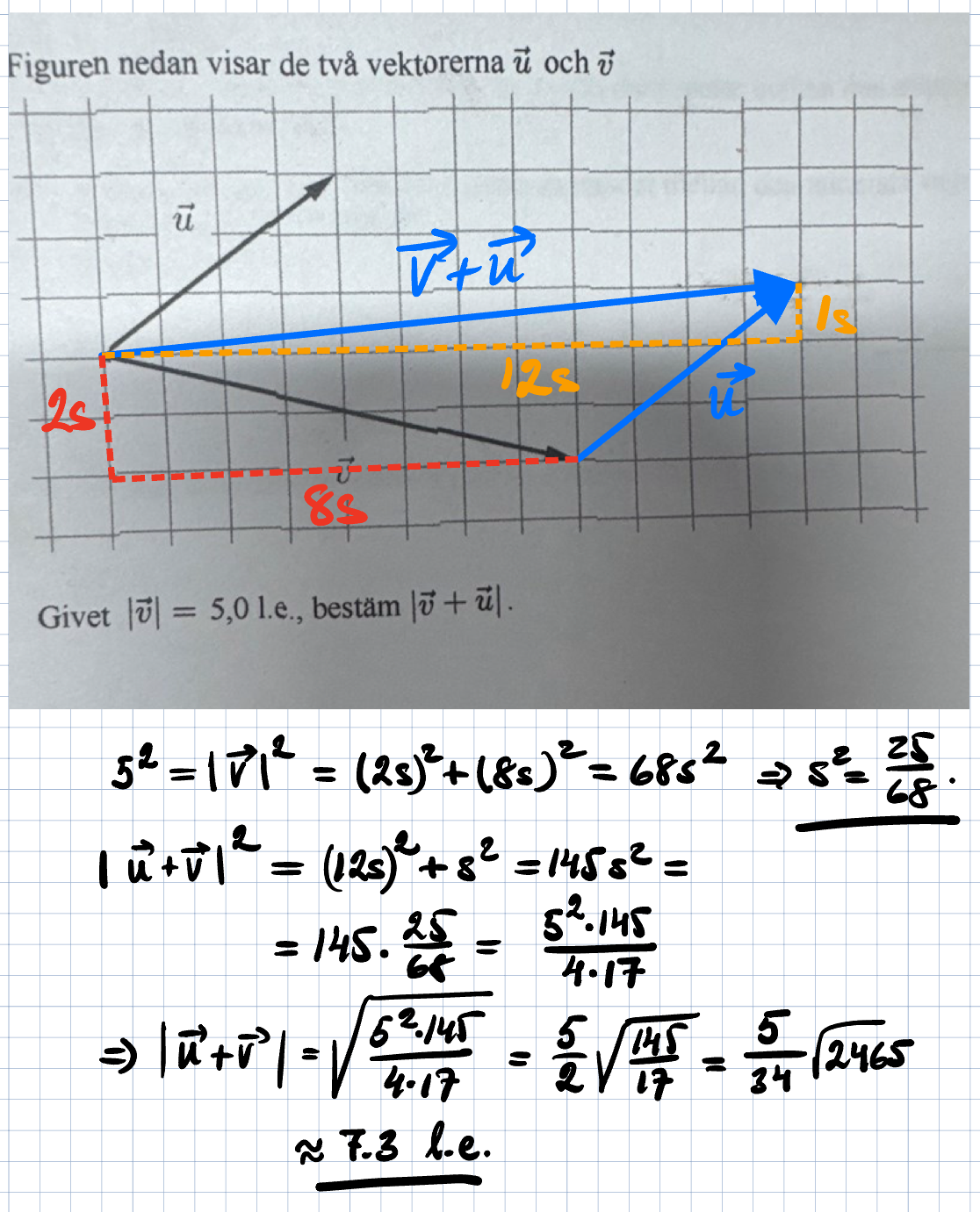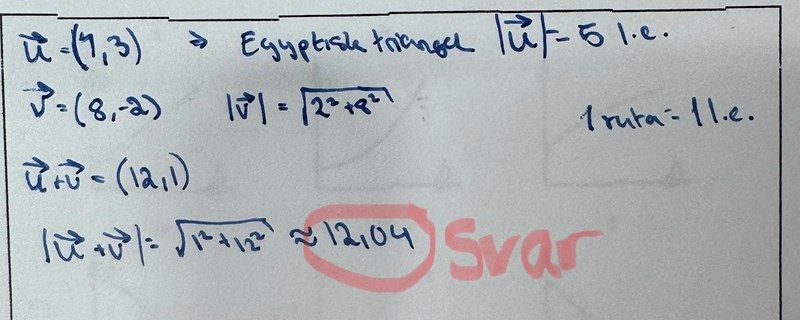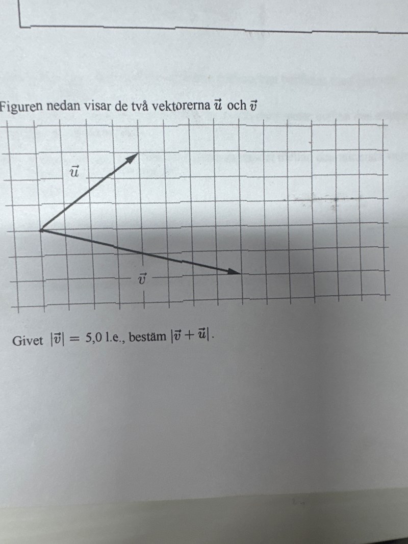 Jag kollade bara på bilden i din spoiler och förstod direkt var jag gjorde fel. Redan i början. Jag trodde att vektorn u hade 5 l.e men det var vektorn v.