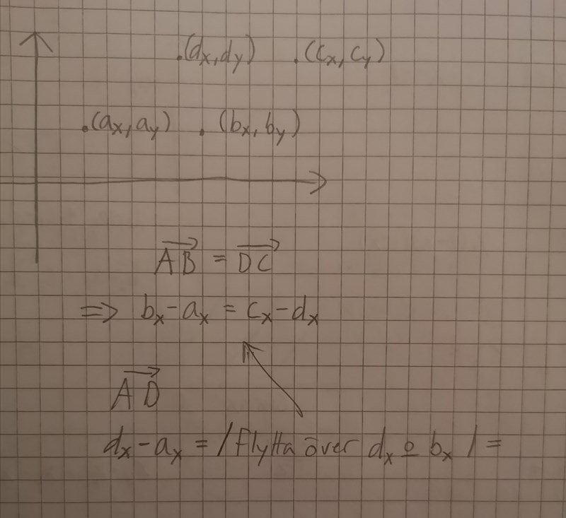 Tex i bilden så ligger a i (2,2) och d i (6,5) om en ruta är 1 lång. Så vektorn ad =d-a=(6-2,5-2)=(4,3).