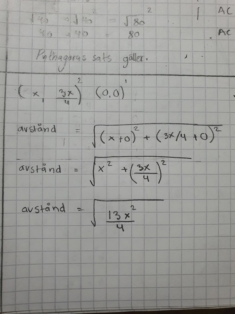 Nu tittar vi på punkten (x, 3x/4). Vad är dess avstånd till origo?