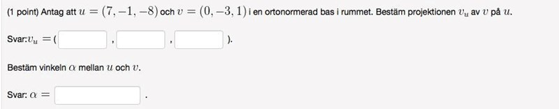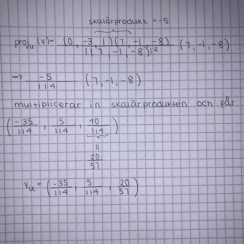 Jag började med att göra en projektion av v på u enligt och sätter in vektorerna u respektive v och får följande svar .