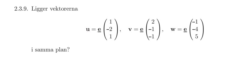 PATENTERAMERA skrev:Att det finns ett plan (dvs ett tvådimensionellt underrum) som innehåller alla vektorerna är ekvivalent med att vektorerna är linjärt beroende.