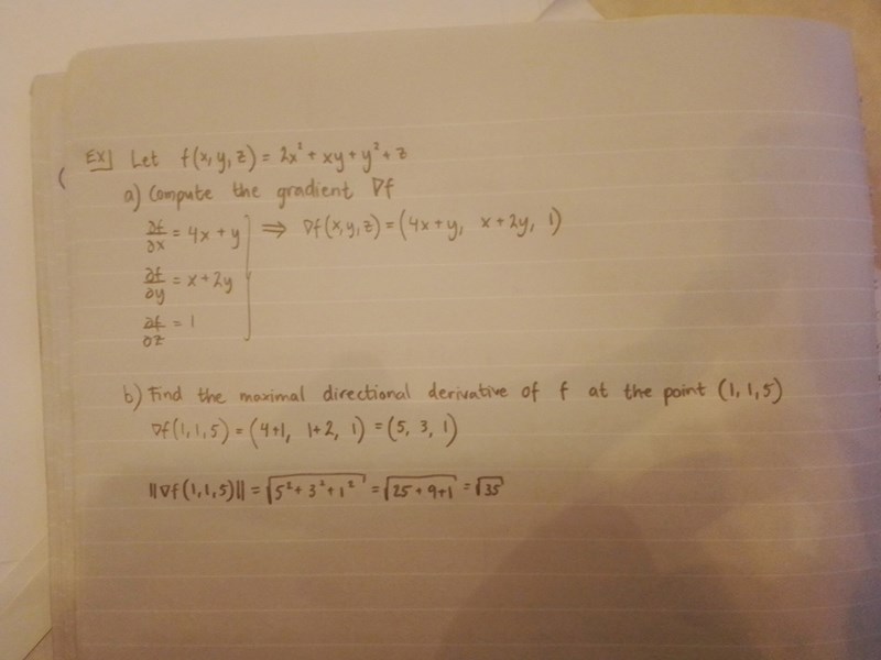 "maximal directional derivative at a point" är då det största värdet vi kan få fram då vi prövar alla möjliga riktningar att röra sig mot från. Att denna enkelt kan räknas ut med vanliga derivationsregler är något vi är tacksamma över. Att det blir ett värde beror på att en derivata är ett värde, som ges av längden av gradientvektorn.