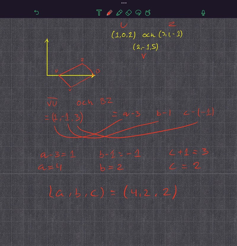 Uppgift: Diagonalerna i en parallellogram har ändpunkterna (1,0) och (4,2) ett av de andra två hörnen är : (2, -1) .. ** Bestäm med vektorräkning, koordinateerna för det återstående hörnet.