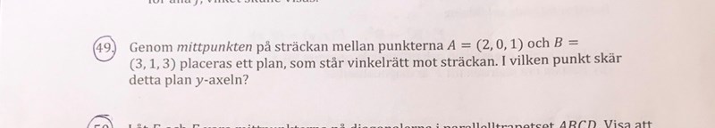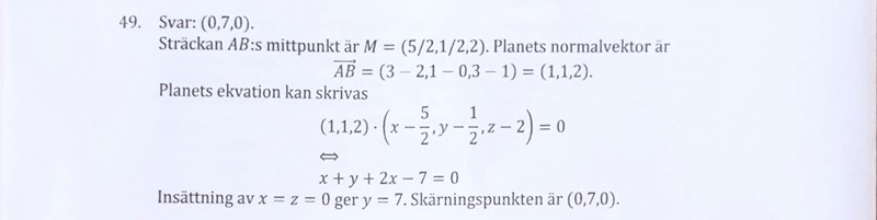 Du vill hitta ett plan som går genom mittpunkten på sträckan AB och som är vinkelrät mot sträckan.