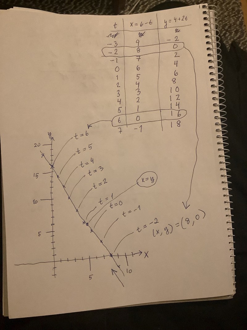 2) Detta t-värde är ointressant för uppgiften. Det ger x = y = 16/3, dvs var linjens x- och y-koordinater är samma. Frågan är för vilket x som y är noll och för vilket y som x är noll.