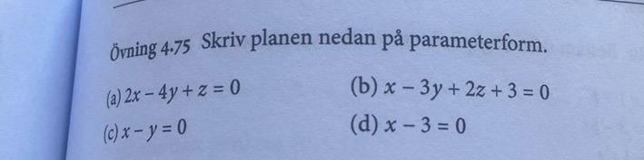 Hej, jag har svårt och veta hur jag ska göra för att göra om ekvationen för ett plan till parameterform. Har specifikt fastnat på den här frågan, skulle uppskatta all hjälp!