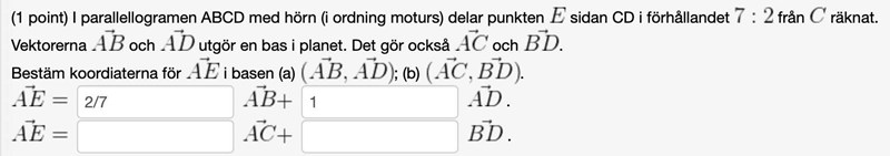 Okej, du anger att vektorn AE\overrightarrow{AE} går 2/7 i riktning AB\overrightarrow{AB} men det stämmer inte, det ska vara 5/9.