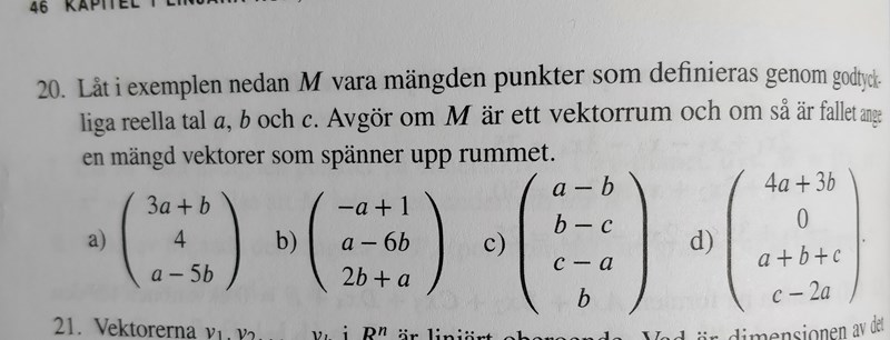 Jag har försökt mig på denna uppgift, men kommer ingenstans. Jag har en liten ide om varför man kan stryka första två, alltså a) och b) men är inte säker på om jag resonerar rätt. Jag tänkte att eftersom a ) och b) inte går igenom 0 och därmed inte kan betraktas som vektorrum, efter som andra raden i a) är en konstant och första raden i b) är summan av en konstant och variabel. Men även om jag skulle konstatera vilka som är vektorrum så vet jag inte hur jag ska ta mig vidare, tack på förhand!