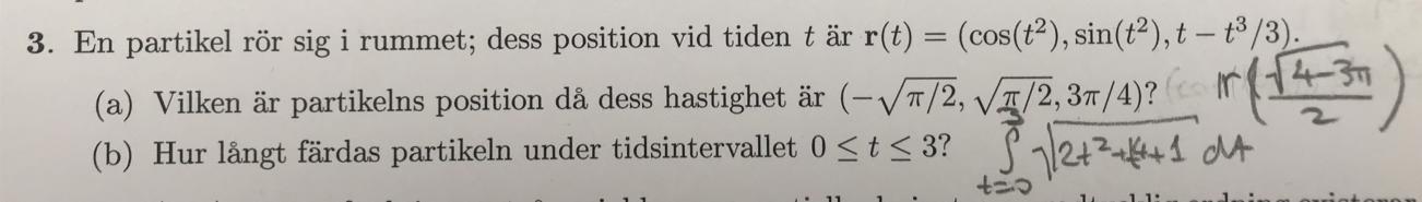 Jag deriverade r(t) för att få hastigheten, sen satt jag den lika med vektorn som står i (a). Dvs
