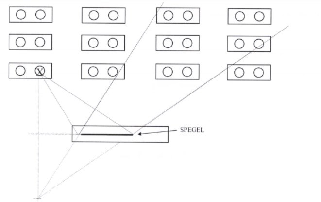 Hej! I denna uppgift skulle man visa genom tydlig konstruktion i figuren vilka elever som Kristina kan se i spegeln. Facit visade denna figur: