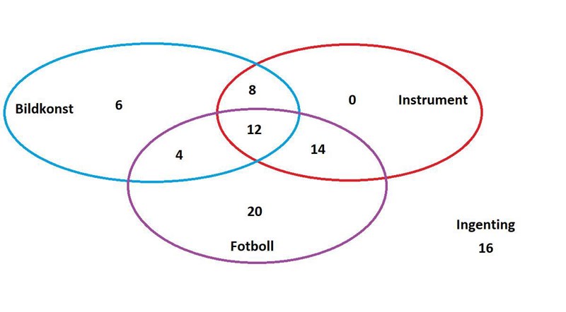 Du har skrivit att tolv personer har alla intressen, och åtta personer har instrument och bildkonst som intressen. Hur många personer rör det sig om totalt? Hur många personer har du skrivit in i ditt diagram?