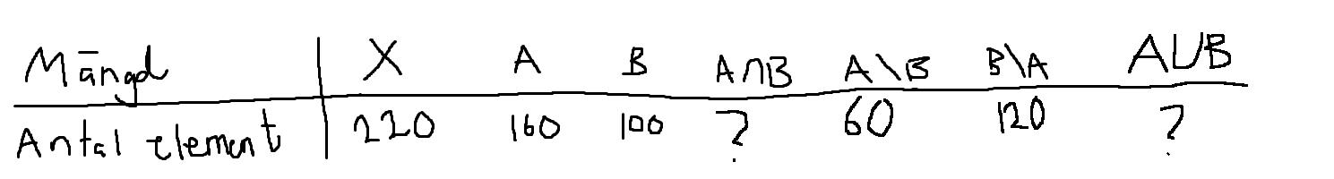 Med den informationen adderade jag sedan A ∩ B + A \ B + B \ A = 30 + 60 + 120 = 210