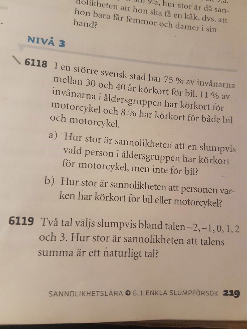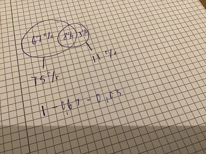 Har ritat ett venndiagram men klarar ändå inte av att lösa uppgiften. Min lärare löste uppgiften genom att ta 1 - 0,75 - 0,03 men jag förstår inte varför. Jag förstår att 75 % är andelen bilister samt att 3 % är andelen mc-förare utan bilkörkort. Men jag får inte det att gå ihop trots att min lärare skrivit så. Varför använde hon just dessa två värden? Skulle uppskatta om någon kunde förklara med ord vad det är min lärare har gjort och varför det fungerar.