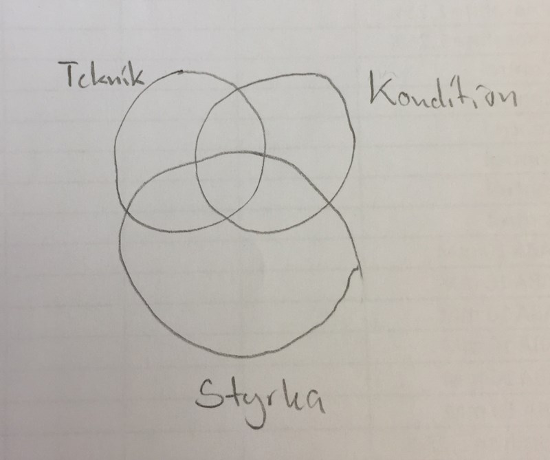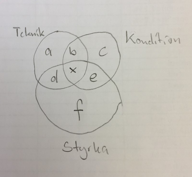 Börja längst in, hur många har valt både teknik, kondition och styrka? Arbeta dig sedan utåt. Hur många har valt teknik och styrka? Hur många har valt styrka och kondition? Hur många har valt kondition och teknik? :)
