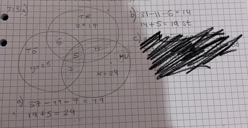 Det var 86 lärare totalt. Kan du räkna samman alla lärare som är med i dina cirklar i venndiagrammet som är antingen trötta, törstiga, hungriga (eller flera av sakerna). Sen att du 86 minus det antalet.