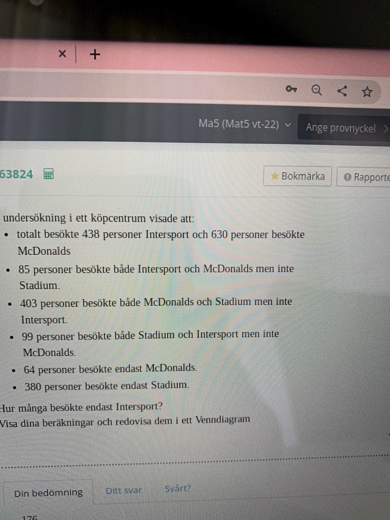 Du kan använda dig av att 630 personer totalt besökte McD för att räkna ut hur många som var i alla tre affärerna. När du vet  detta kan du komma vidare, eller hur?