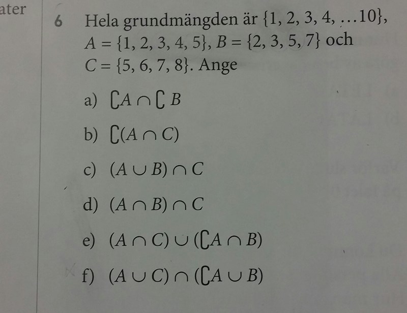 Jag brukar försöka rita upp en venndiagram när löser såna uppgifter och sedan skuggar över området, det gör det mycket lättare. Men just e) och f) i uppgiften har jag bara haft svårt att tolka.