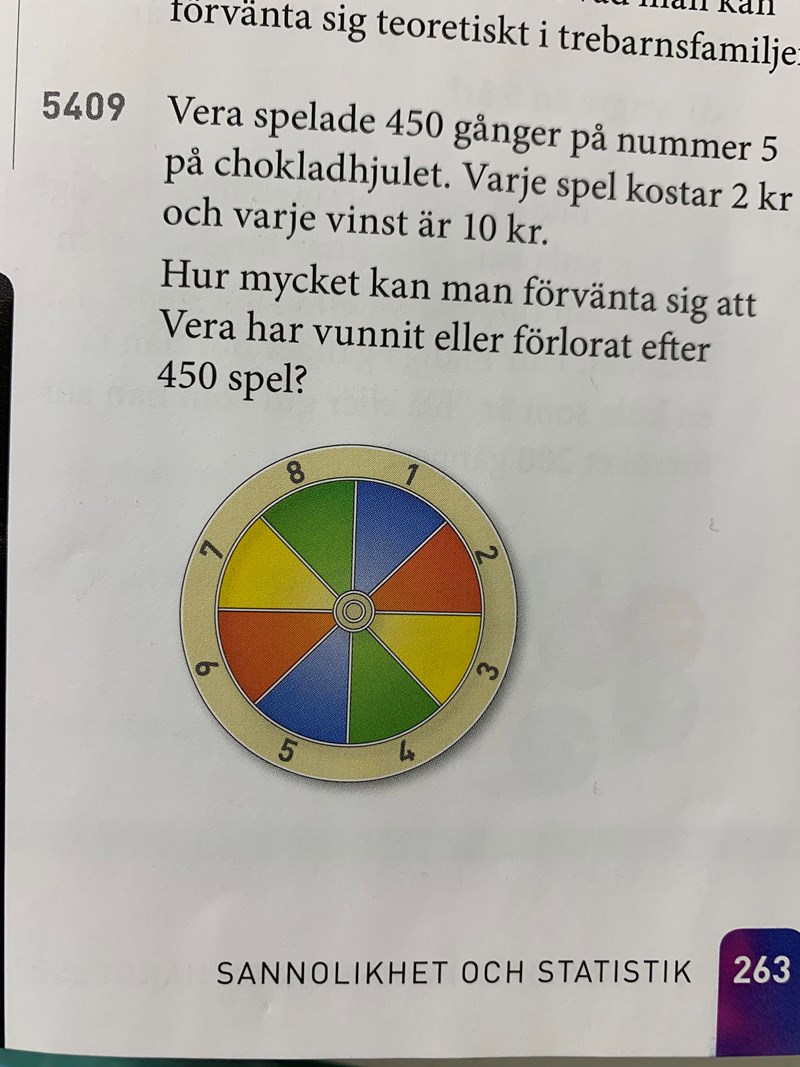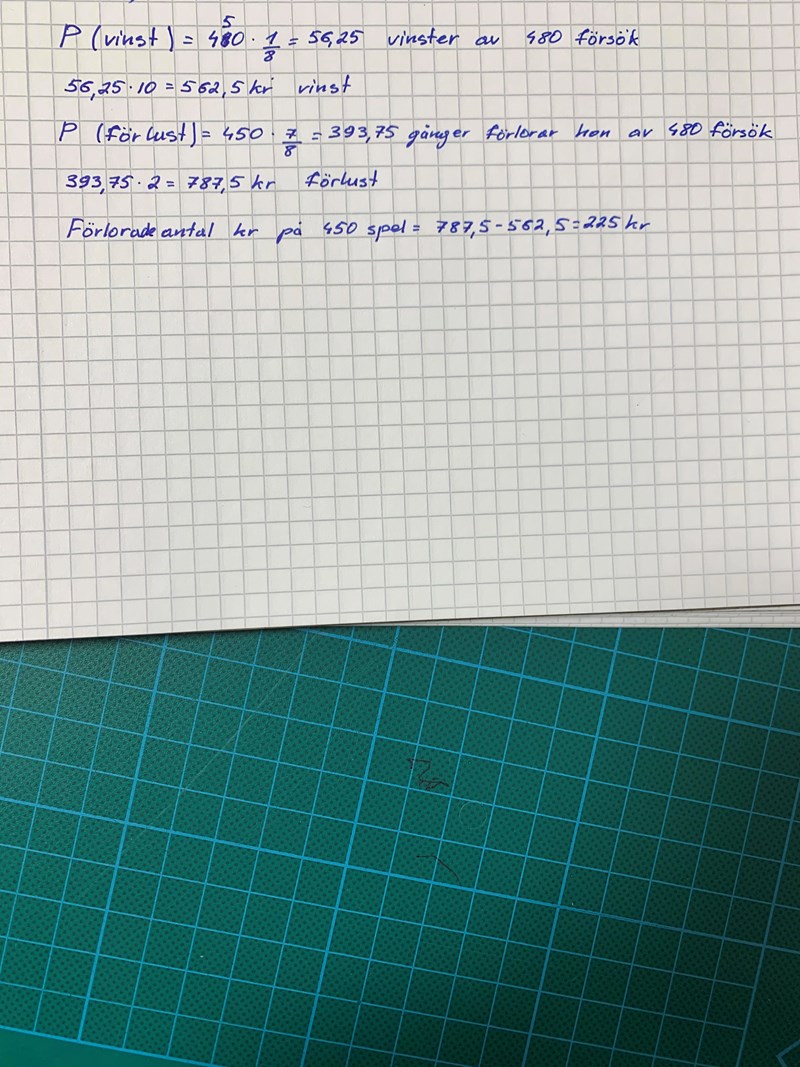 Chansen att vinna ser ut att vara 1/8. Om hon spelar 450 ggr borde hon vinna ungefär 450/8 = 56,25 ggr. Varje vinst är 10 kr, så hon borde vinna ungefär 562,50 kr.