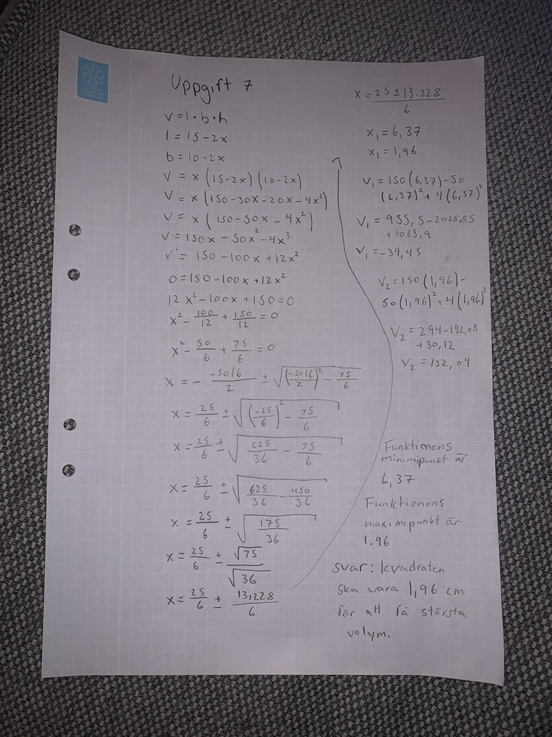 En plåtskiva har formen av en rektangel med sidorna 10 cm och 15 cm. Genom att klippa bort lika stora kvadrater i varje hörn och sedan vika plåtskivan kan man tillverka en öppen låda. Hur stor skall sidan i varje kvadrat vara för att lådans volym skall bli så stor som möjligt? Beräkna också vad volymen då blir.