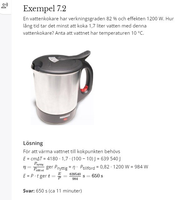 Ähm, är du säker på att effekten var 9 kW? Det är extremt mycket. Om effekten vore det skulle det tagit 14 s med en verkningsgrad på 100 %, vilket är löjligt snabbt.