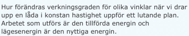 Det du sen kan fundera på: Hur påverkas friktionen av lutningen? Hur påverkas arbetet av lutningen? Hur påverkas lägesenergin?