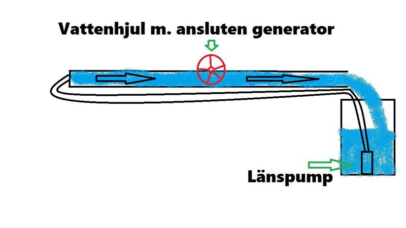 Vår ursprungliga idé var en ansluten mini-generator. Med hjälp av en multimeter skulle vi enkelt kunna räkna ut effekten. Ett konstant vattenflöde skulle råda exempelvis genom att använda en pump. Problemet här är att minigeneratorer verkar svåra att hitta, och de alternativ skolan har är tydligen inte lämpliga (opålitliga mätvärden enligt lärare). Dessutom är det svårt att kontrollera varvtal och utväxling som man egentligen bör ta i beaktning.