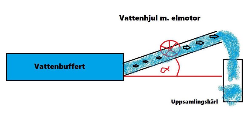 Just nu överväger vi huruvida det vore en bra metod att istället tvärt om låta vattnet driva hjulet. Ett mycket svagt uppåtlut på rännan, en "buffert" för att i princip hålla vattennivån hos hjulet konstant under mätningen och en liten elmotor ansluten till hjulet som matas med konstant spänning. Är det någon som vet om detta skulle kunna vara en gångbar metod? Genom att beräkna volymen flyttat vatten per tidsenhet är det möjligt att beräkna verkningsgrad, och effekten som motorn ger är konstant. Är detta ett alstrande vattenhjul omvänt eller är att "trycka" vatten en helt annan sak än att låta vatten trycka? I bilden är vinkeln alfa kraftigt överdriven.