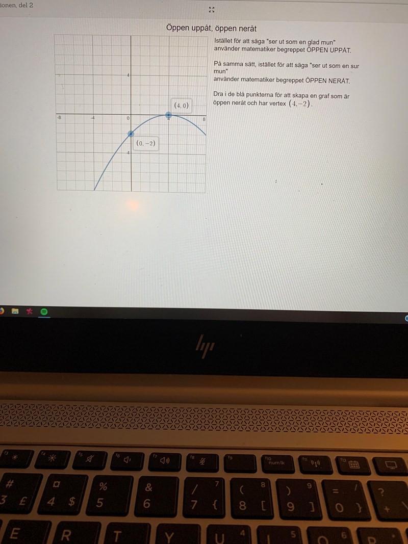 Jag vet inte exakt hur ditt digitala verktyg fungerar när du drar i punkterna men du måste ju i alla fall se till så att du drar vertexpunkten till den punkten som Yngve har visat. Hur ser det ut då? Blir det problem med något annat då?