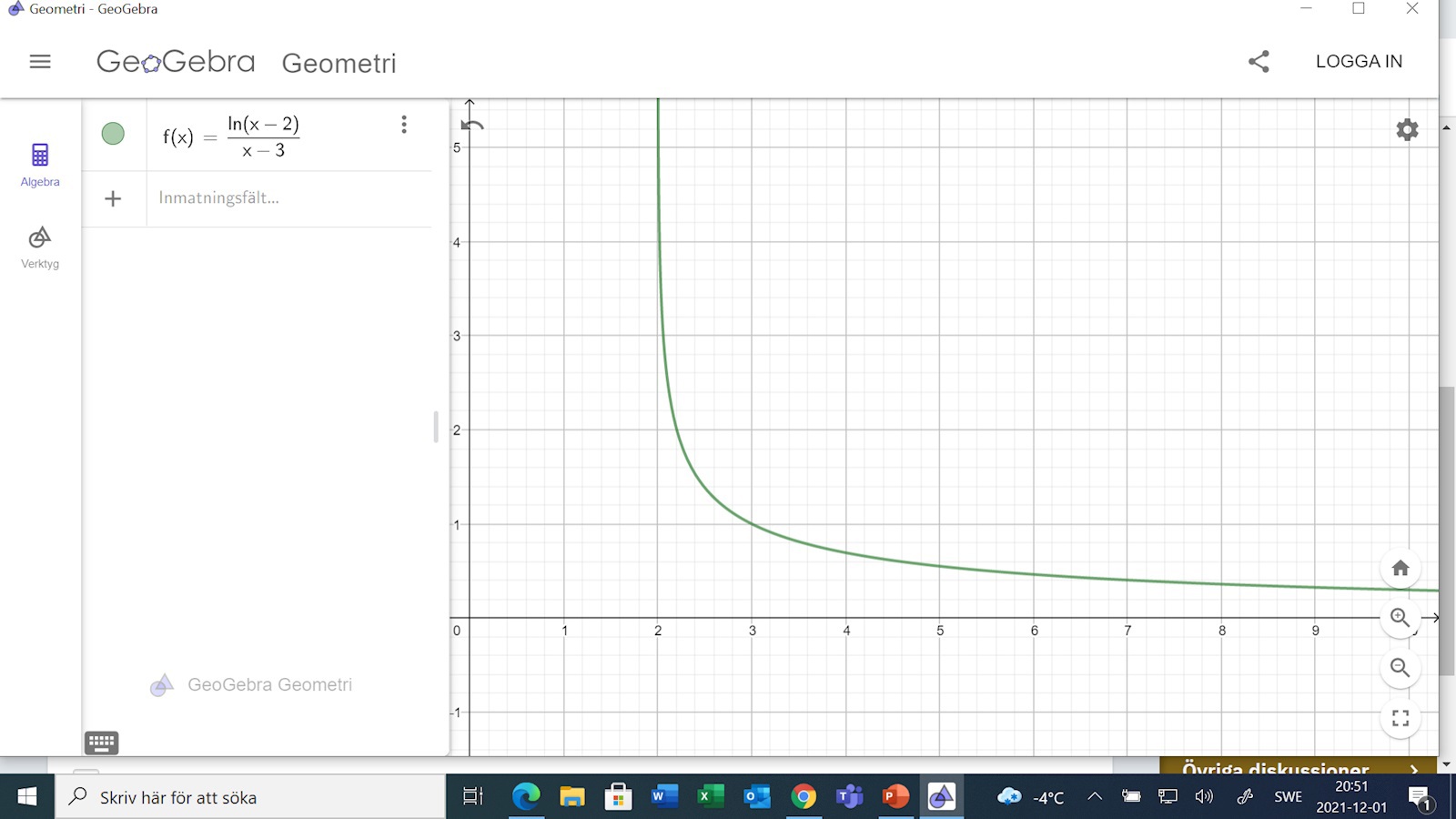 x=3 ger , tillämpar man l'Hopitals regel får man asymptot x=2, precis som du fått fram.